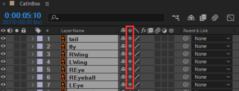 이대로는 이미지를 확대하면 깨지기 때문에, [Timeline] 패널에서 반짝이 모양 Rasterize switch를 모두 켜줍니다.