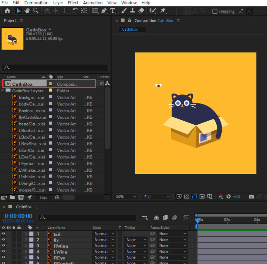 레이어가 나뉜 컴포지션이 생성되었습니다.