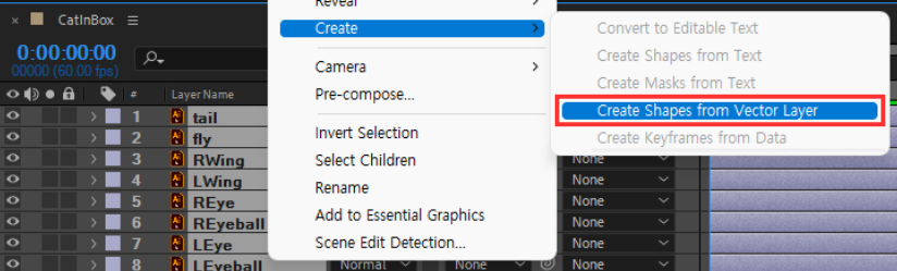Ai 레이어 선택 후 우클릭 - Create Shapes from Vector Layer 를 클릭하면 Shape Layer가 만들어집니다.