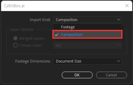 Footage Dimensions : 레이어 크기대로 불러오려면 Layer Size, 일러스트 아트보드의 사이즈대로 불러오려면 Document Size로 불러오면 됩니다. 여기서는 Document Size로 가져왔습니다.