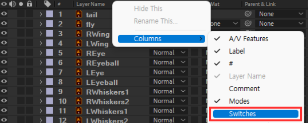 만약 스위치가 보이지 않는다면 패널 상단을 우클릭해 Columns - Switches 를 체크해줍니다.